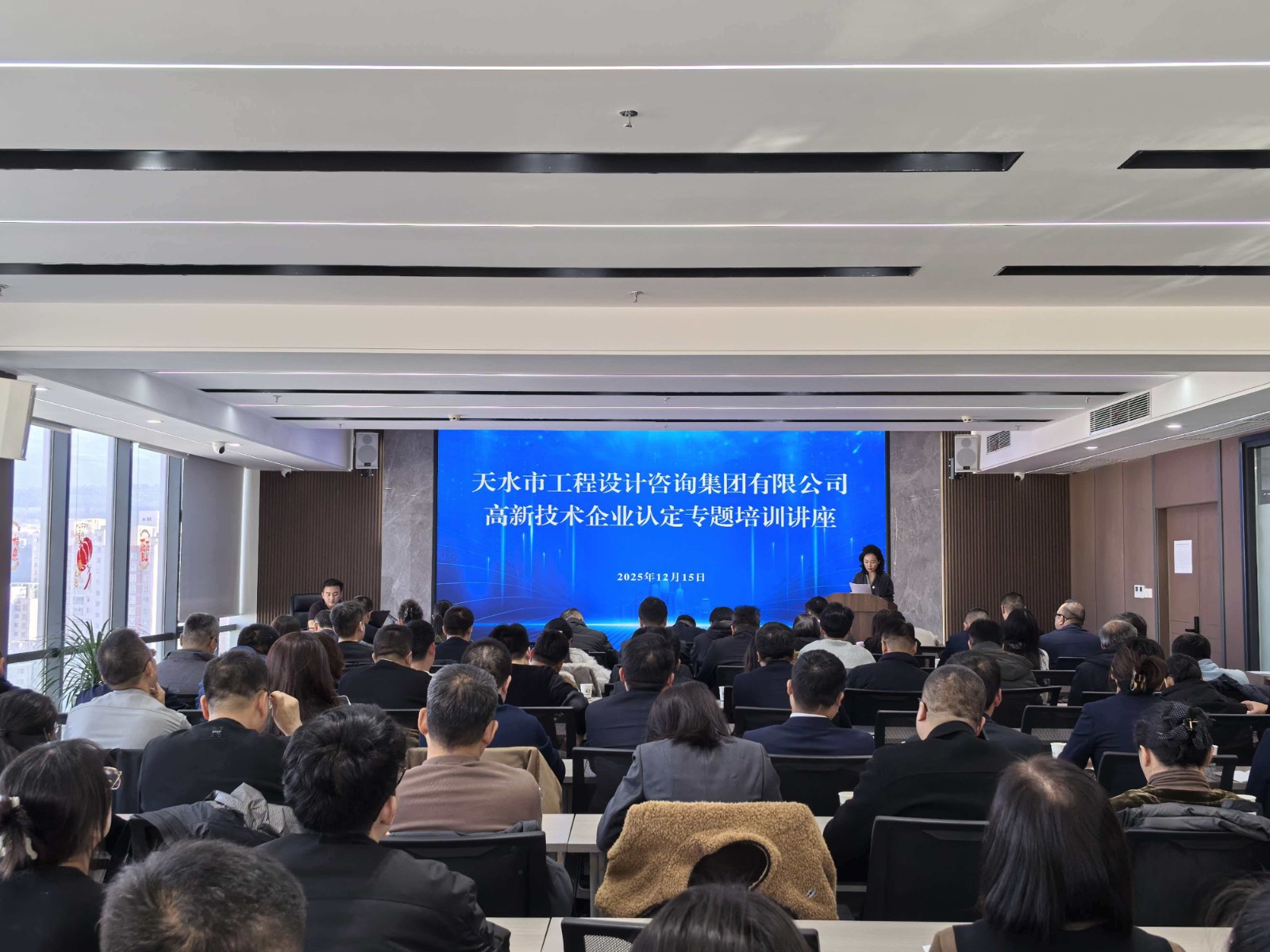 为深入推进集团公司创新体系建设,助力各子公司规范研发管理、提升自主创新能力,2025年12月15日下午,天水市工程设计咨询集团有限公司在我公司15楼会议室组织召开了“高新技术企业认定相关专题培训讲座”。集团公司党委副书记、总经理李陆基、副总经理白雪芳、丁芳军及各子公司技术研发分管领导、研发负责人、财务负责人及相关职工共计90余人参加了本次培训。