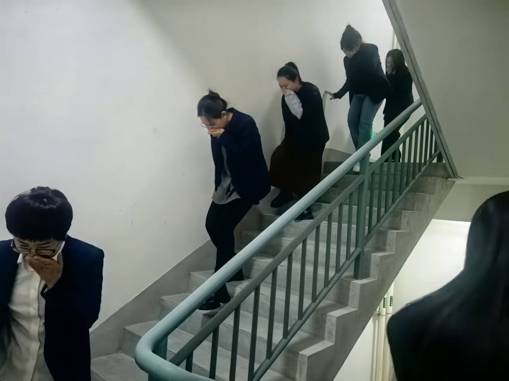 培训结束后,应急演练环节随即启动。随着模拟火灾警报响起,全体职工在教官与工作人员的指引下,迅速进入应急状态——弯腰低姿、湿毛巾捂口鼻,沿预定疏散路线,快速、有序地从办公区撤离至楼下安全区域,整个疏散过程紧张有序、规范高效。